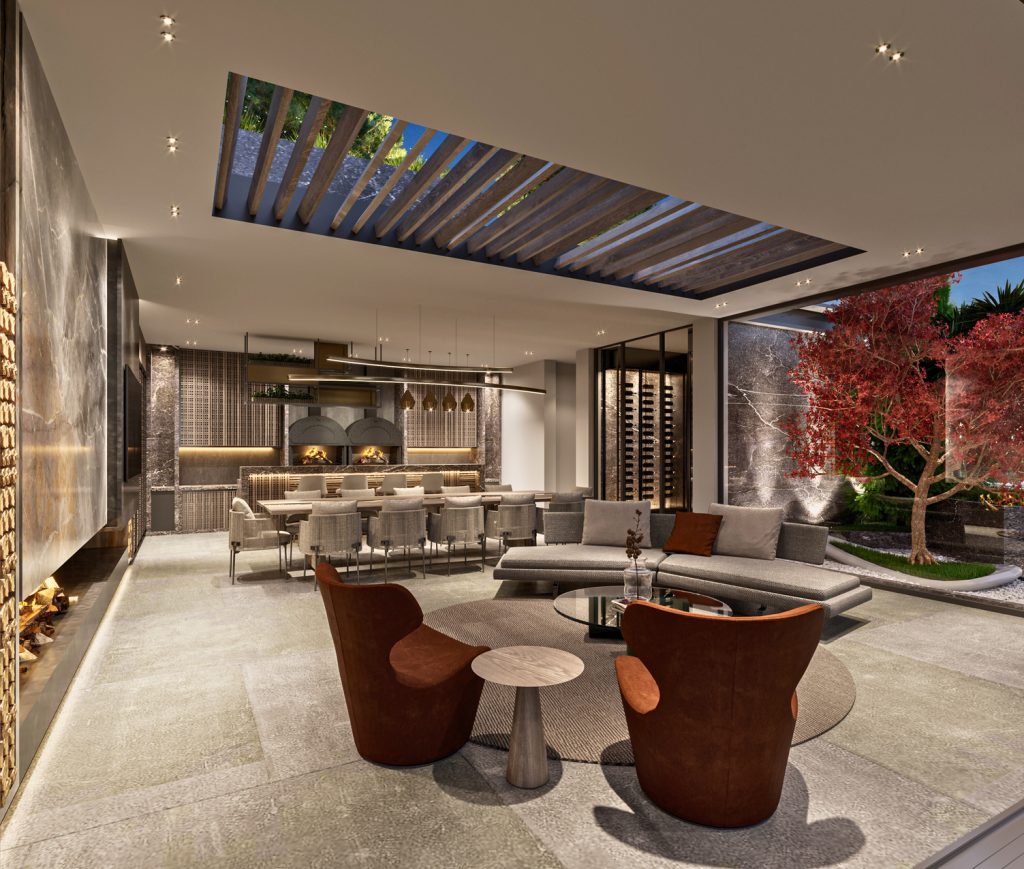 This project seamlessly blends contemporary architectural lines with natural materials to create a living space that is both aesthetically pleasing and highly functional. The smooth transition between indoor and outdoor areas emphasizes comfort and intimacy in social spaces. The expansive outdoor seating and modern fireplace extend the living experience beyond the interior, creating a connection