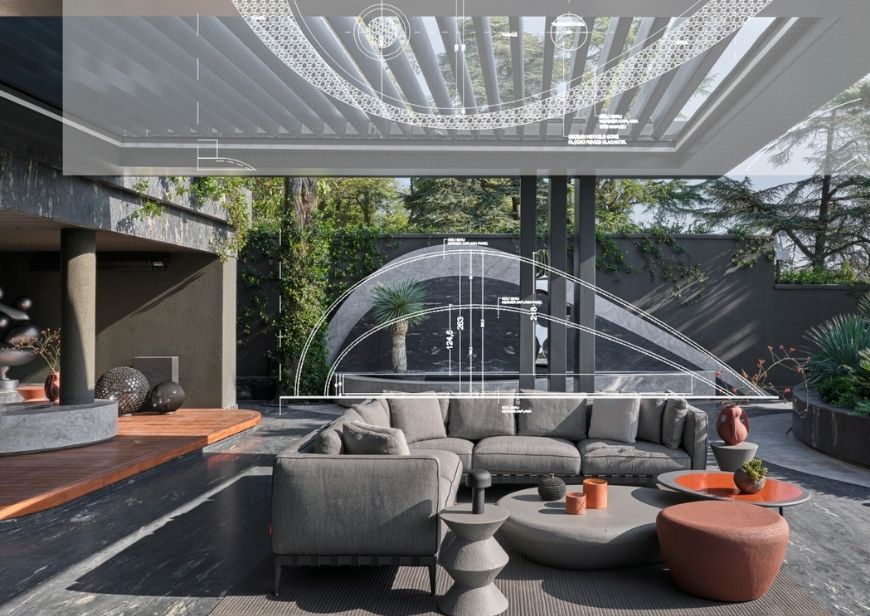 Set against the backdrop of a lush landscape and distant hills, this outdoor pavilion redefines the idea of open-air social spaces. Designed